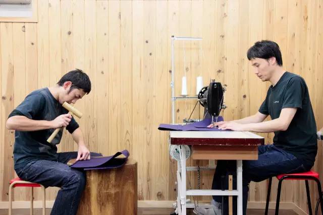捶打會由比較資淺的工匠在一個圓木樁上進(jìn)行。敲出折角后,再交給資深的前輩進(jìn)行縫紉。據(jù)說,他們家工匠隨著制作帆布袋技術(shù)的提升,從圓木樁走到縫紉機(jī)這個面對面的距離,所需要的時間是 7-8 年。